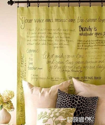 在床头挂上一个帘子,和朋友或家人一同用马克笔随意书写,形成一个独一无二的床头板。