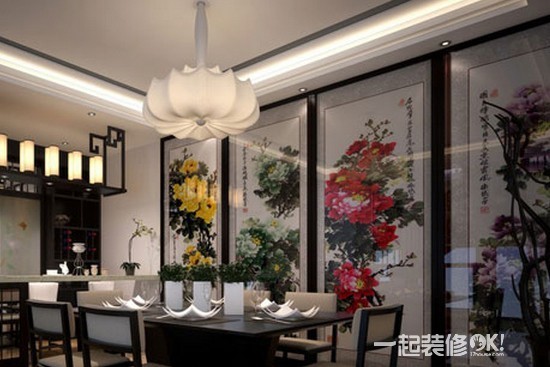 大户型的餐厅大可想图中的餐厅这样装饰,莲花吊灯以及国花挂画都可以让中式餐厅别有一番雅韵。