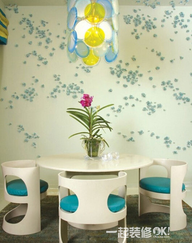 小编的话:圆形白色小餐桌与可爱的椅子相配,墙面上零星的天蓝色立体小花瓣点缀于白色墙面上,与椅子上的蓝色很搭,塑料圆形鳞片以对比色呈现,在灯光的映衬下显得通透明亮。