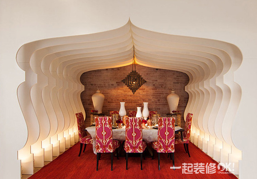 小编的话:古旧感的文化石背景墙充满复古风味,与时尚优雅的天花和墙壁设计形成强烈对比,巨大的反差让餐厅独具魅力。红色地毯防止了餐桌椅与地板的摩擦,同时也提升了空间的活力。