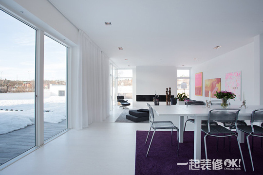小编的话:大面积落地窗和透明推拉门提亮空间,增加采光,同时也扩展了空间视野,增强通风性。一块紫色地毯轻而易举地划分出餐厅区域,与空间的白色主色调形成强烈的视觉冲击力。