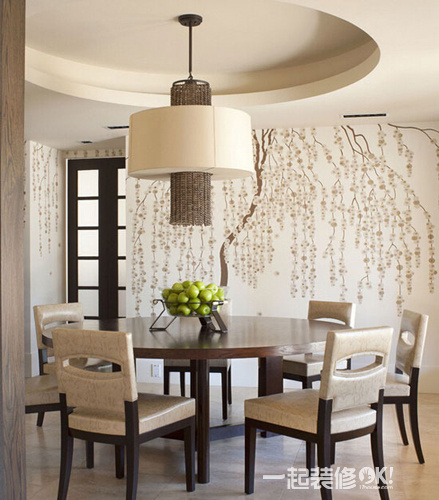 小编的话:用餐区域天花板以圆形吊顶与圆形桌面遥相呼应,使整个用餐区看起来显得井井有条,利用墙贴在餐桌一旁的墙面上贴出一整面树枝图案的背景墙,让原本单调的墙面看起来拥有一份丰富感。