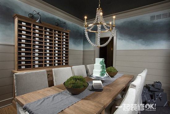 小编的话:规律、密布的格子提升了酒架的收纳能力,也使酒瓶的摆放更有条理。背景墙的带状水墨画装饰美化了空间,延伸了视野,也从视觉上提升了餐厅的高度。
