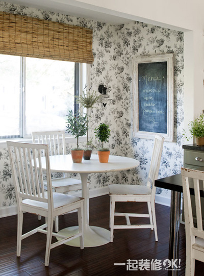 小编的话:墙壁上挂张小黑板,写着每日菜单,温馨提示,颇富生活气息。此外,搭配黑色印花墙纸,温馨浪漫,可感受到浓浓的爱意。