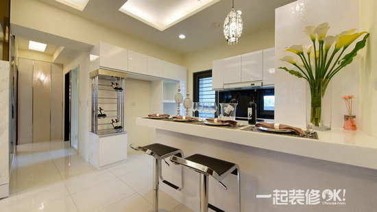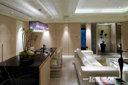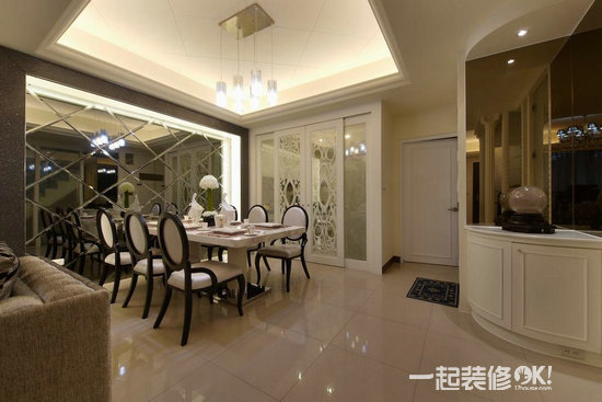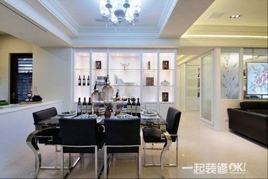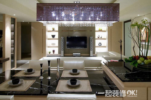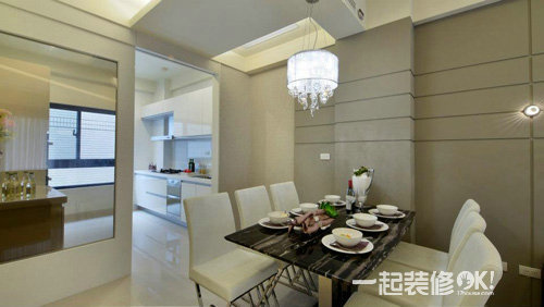 编辑点评:于餐厅的水晶灯外面加上一层薄膜设计,减缓于视觉上的锐利效果,整体营造出低调而优雅华丽的气氛。餐桌还是简单素雅为原则,高低的错落设计,下方作收纳功能使用,平常节日的时候可以在上面摆设装饰品点缀环境,兼具备餐台的机能。