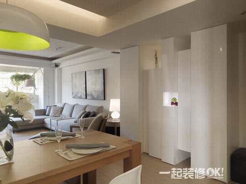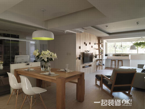 编辑点评:以布料作灯罩的设计,柔化亮度;利用橡木做直、横线条式的分割造型处理,与厨房之间的门片做隐藏式安排,于一旁设置收纳空间可收纳大型行李。