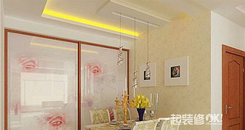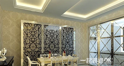 以屏风作为餐厅背景墙,也是个十分不错的设计,黑色衬底的白色的图案搭配银色的边框,使这个背景墙具有了一股中式的韵味,和背后黄色墙纸搭配得相得益彰。