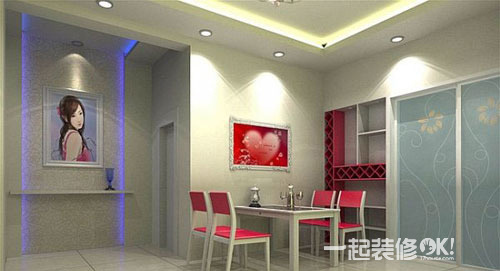 以红色为主色调的餐厅设计。十分适合婚房的布置,在墙面上挂上一幅爱心的图案的装饰画,使这个空间充满了爱的甜蜜。而红色的座椅也很好地配合了这一气氛。