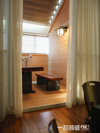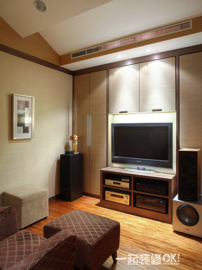 屋主对音响视听器材的质量相当讲究,所以在视听室的配置上设计师也很用心,像是天花板选用折板,可使音频有效传递且具笼音功能,墙壁部分全都规划吸音材质的壁面,可以充分展现音响完整音质。