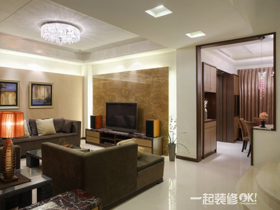 电视墙(欧式电视墙壁纸的选购)以浅金锋大理石装饰,从墙后打出光间接光线突显出主墙的重度。