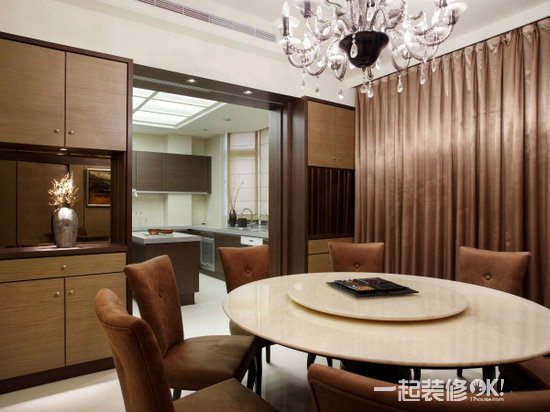 将餐厅与厨房格局打通,动线顿时顺畅便利,承袭客厅一贯新古典风格,水晶灯及窗幔形塑出优雅的用餐环境。