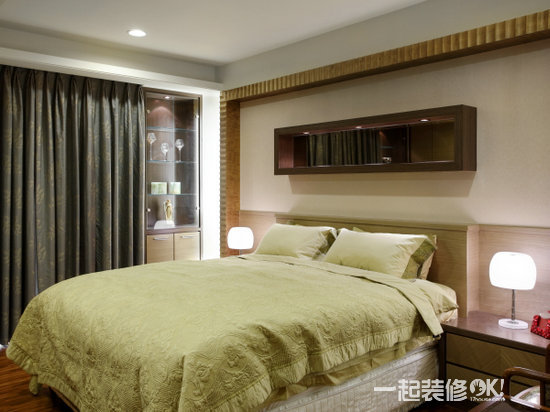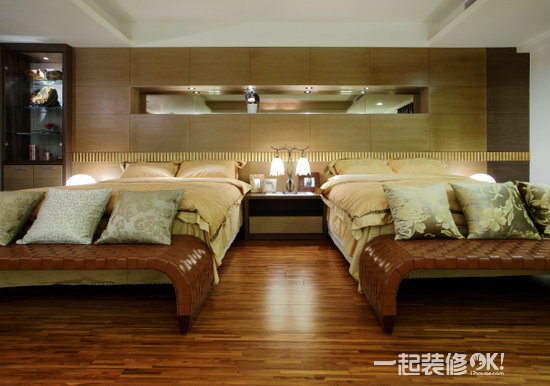 长辈房睡眠习惯及作息不同为避免干扰双方采两个单人床的配置,同在一个空间却能独自享有自我空间,对于年长的双亲真是贴心的安排规划。温润的木质营造令人心旷神怡的自然感受,床头柜体中以凹槽做出照明,一方面巧妙的将梁虚化,一方面幽暗的灯光可作为夜灯使用,照顾长辈夜间行动时的安全考虑。