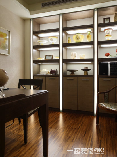 书房的展示柜以胡桃木木作搭建,发光的线条在沈稳中散发出利落鲜明的个性化风格。