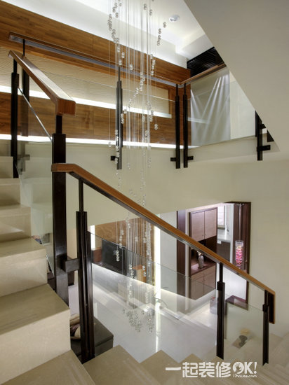 楼梯扶手以不锈钢烤漆及强化玻璃为主体,订制一盏八米高的光纤LED水晶吊灯,成为楼梯间吸睛的主要装置,楼梯中央具有穿透感不论在任何角度都能欣赏到美丽的水晶发光体。