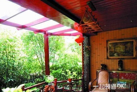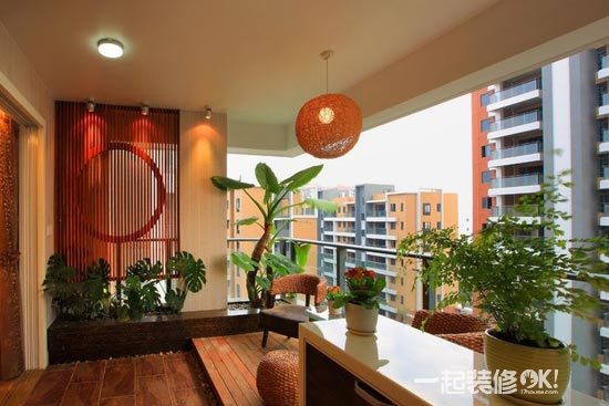 这是一款非常时尚大方的暖色系阳台吊顶装修效果图。整体采用木制的家居,呈现大方简约的中式装修风范。黄色的吊顶搭配一盏颇具自然形态的吊灯,整体张力十足。