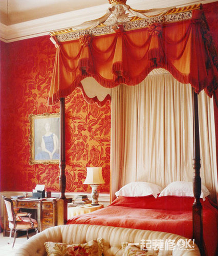 小编的话:整个房间充满典雅气息,所以床头帷幔以及背景墙在上色时要偏向稳重一点的暗红色,花纹壁纸和床架上方王室范的装饰都让卧室空间变身气质极佳的公主系。