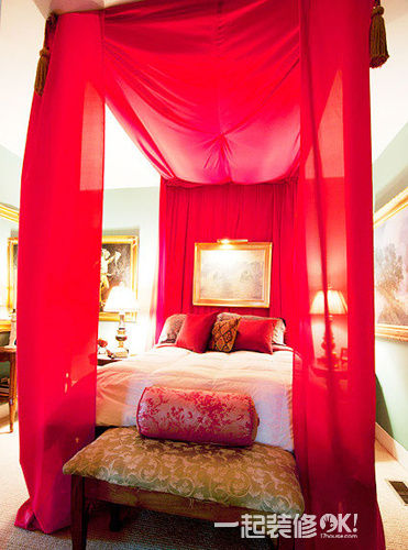 小编的话:房中墙面和其他家具都是正常的淡色系,但是为了营造婚房的感觉,就在床架上方放上了厚厚长长的大红色帷幔。红布头一直从床头背景墙上延伸到床尾架子上,全部放下来就能将床包围起来。