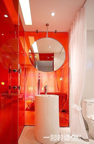 小编的话:卫浴中肯定会有镜子的存在,随意想要营造温馨和热情感,并不一定要将整个卫浴都装成红色,不妨在镜子对面设计一面红色墙面,这样镜子就能将其反射出来,能在白色的卫浴间中渲染出更多的红色,产生新房所需要的感觉。