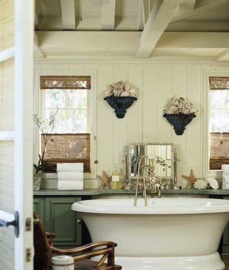 自然卫浴给人一种清新自然的感觉,让人在卫浴空间里得到舒适的放松与享受。草绿色的整体基调,配合恰到好处的藤、竹等天然家具元素,打造出自然闲适的浴室。而一些海星、海螺、贝壳类的装饰品更是将地中海风格与同样闲适随意的乡村风格来了次大融合。