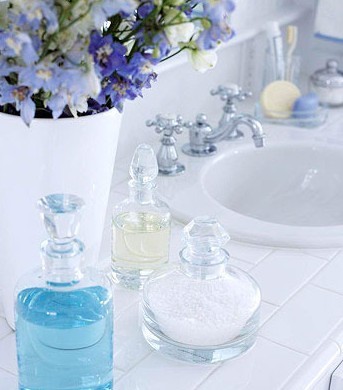 洗面盆上各种透亮的瓶子,包装精美的沐浴皂,透着随意与清凉。一束紫色紫尾草,带来自然的气息,让原本有些平淡的视觉效果完全改观。