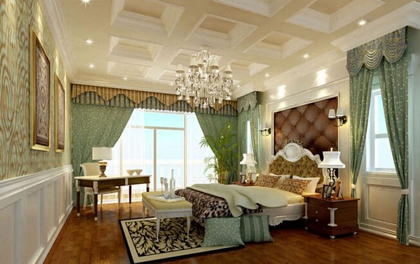 此款欧式风格卧室,墙面的颜色以暖色调为主,拥有简约流畅的线条美。其在颜色搭配选择上,采用淡绿色的点纹图案窗帘与淡绿色床套颜色相映衬,在照明灯光的衬托下,仿佛沐浴在春季的阳光中。