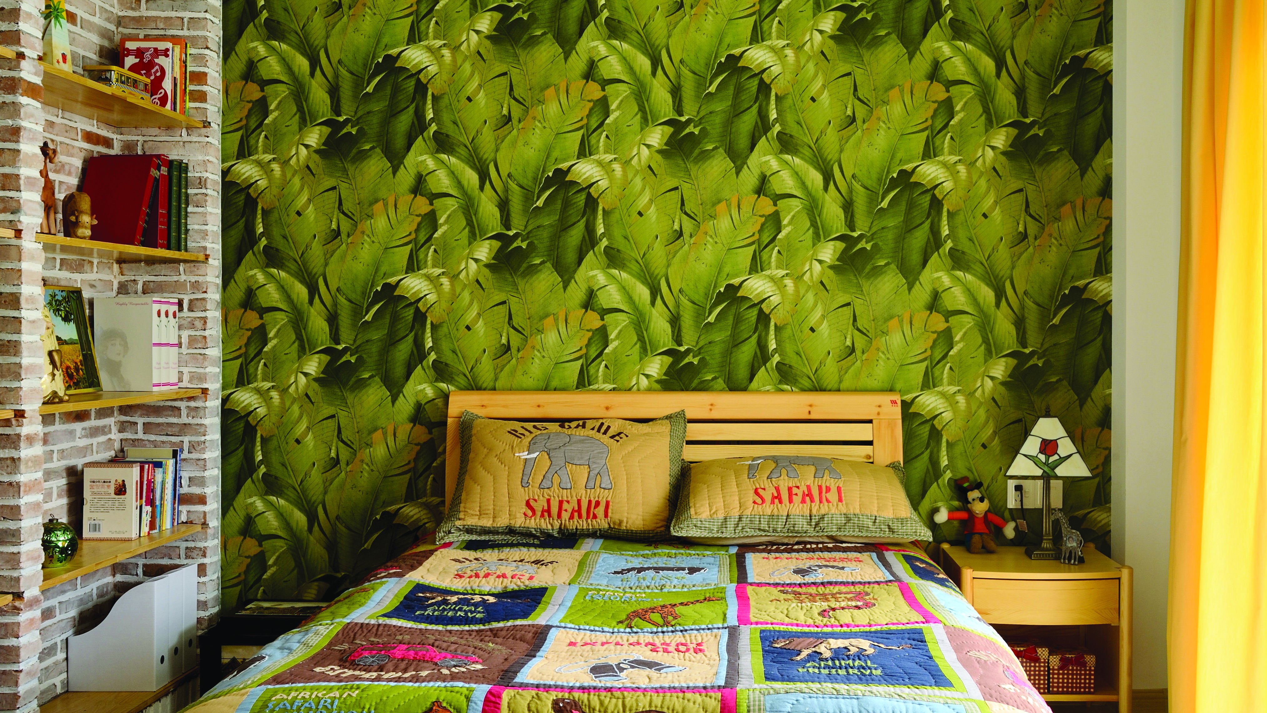 此款儿童卧室设计采用混搭风格,推开门满眼的绿色映入眼帘,采用大图纹的植物图案让卧室平添了一抹生机与灵动。采用拥有大象图案的套枕、蓝绿交错的床单与绿色墙纸交相辉映仿佛游走在春季动物园中。