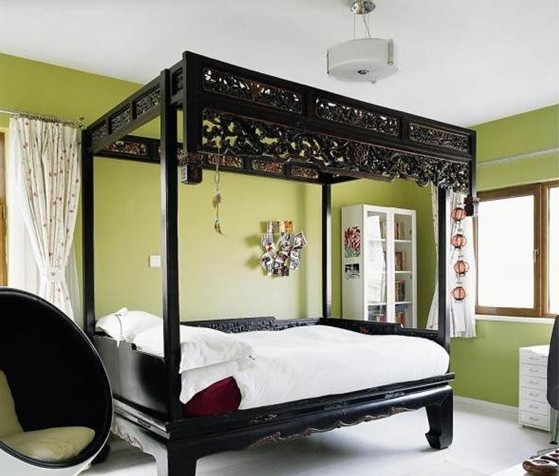 此款中式风格卧室设计将中国传统文化在现代背景下进行了完美的演绎,其墙面全部采用草绿色的壁纸将春意永久的留在了卧室空间里,窗边的淡雅田园窗帘更是描绘了一幅田园春色景象。