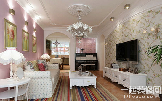 白色石膏线条围成的吊顶,搭配仿古砖拼花设计的地面,配合高档大气的花盆式吊灯,带来一丝复古与现代气息结合的味道。榻榻米式软包清新沙发,搭配白色方形茶几桌与条格子式地毯,彰显出个性化。白底小碎花壁纸电视背景墙搭配粉色的沙发背景墙,让人觉得浪漫又乡村。 -