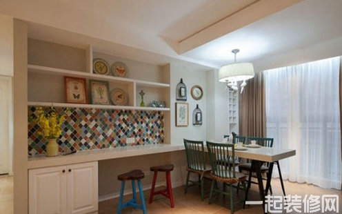 质朴温馨的餐厅装修,实木的餐桌椅大方而又独具自然质朴的气息,最出众的就要数餐厅背景墙的设计了, 墙面上拱形的区域,层层的实木搁架和餐厅的整体布置相搭配,同时还为你提供了一定的物品摆放空间,整体设计十分的和谐美好。 -