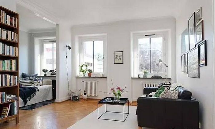 50平米一个人住,不装房门行不行?别误会,这里的不装房门不是让你不安装大门,而是室内空间的房门全部取消,用门框和隔间来区分不同空间,省下的开门的空间,可以作为收纳的地方。这个只有50平米的小空间,变得宽敞而明亮。 -
