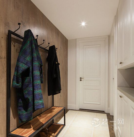玄关的一侧打造了上下收纳柜,另一侧是更换鞋帽的地方,非常实用,凹进去的那个小角落正好放下一个装饰架。