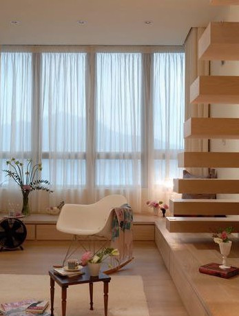 此案例的夹层规划上,聪明利用楼梯上的一段高度,加入了阅读空间;也就是说,在最主要生活空间之外,利用夹层方式,达成主卧、客房加上阅读区的超值效益。