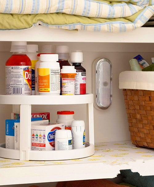 购买一个小小的置物架,能放进柜子的隔层间,将瓶瓶罐罐都摆放其上,井然有序。即使是小小的空间也能得到大大的利用。